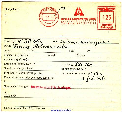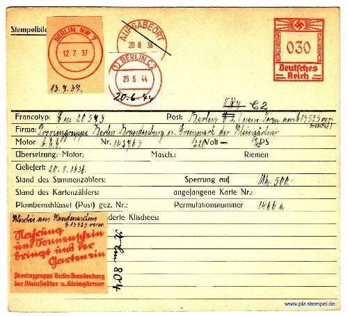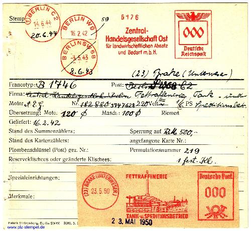 Francotyp Maschinenkarte, Modell FRANCOTYP "B", Masch.-Nr. B1746;   Verlagerung der Fa. nach Berlin C2, Anfertigung eines neuen Tagesstempels