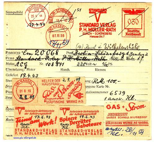3b. Absenderfreistempel der Lieferfirma Freistempler Gesellschaft mbH, Frankfurt/Main; Hersteller Telefonbau und Normalzeit GmbH, Frankfurt/Main.