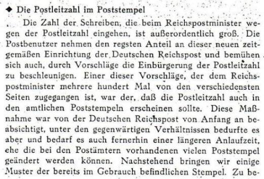 1944: Februar 1944, Ausarbeitung von Vorschlägen durch die Fa. Francotyp-Gesellschaft m.b.H., Berlin zwecks Einfügung der PLZ in den Stempelgeräten. Lt. postinterner Entscheidung vom 8.3.1944 soll die PLZ grundsätzlich der Ortsangabe im Tagesstempel vorangesetzt werden, bei begründeten Ausnahmefällen kann sie im Feld oberhalb der Tagesangaben stehen.