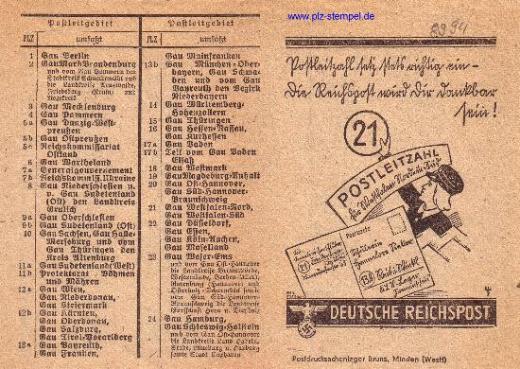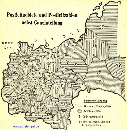 Die Postleitzahlen wurden noch während des 2. Weltkrieges von der Deutschen Reichspost eingeführt, die Postleitgebiete erstreckten sich ab 1943 vom Westwall bis zur Ukraine.