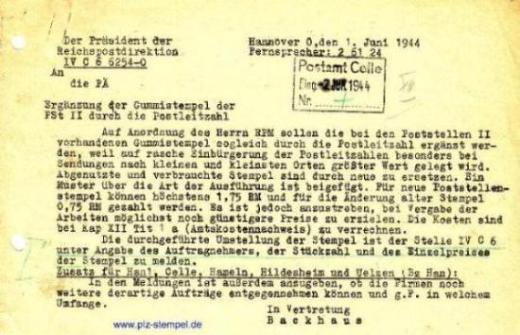 1944: 21.4.1944, Verfügungen zur Aufnahme der PLZ in den Poststempeln. Genauer Wortlaut noch unbekannt, da diese in der Literatur bisher weder abgebildet noch der genaue Wortlaut zitiert wurde.